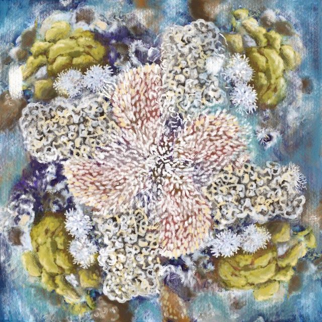9 »Great Barrier Reef - coral bleaching«. Digitale Zeichnung, 4/0 Sublimationsdruck auf Polyester, 80 x 80 cm, 2023